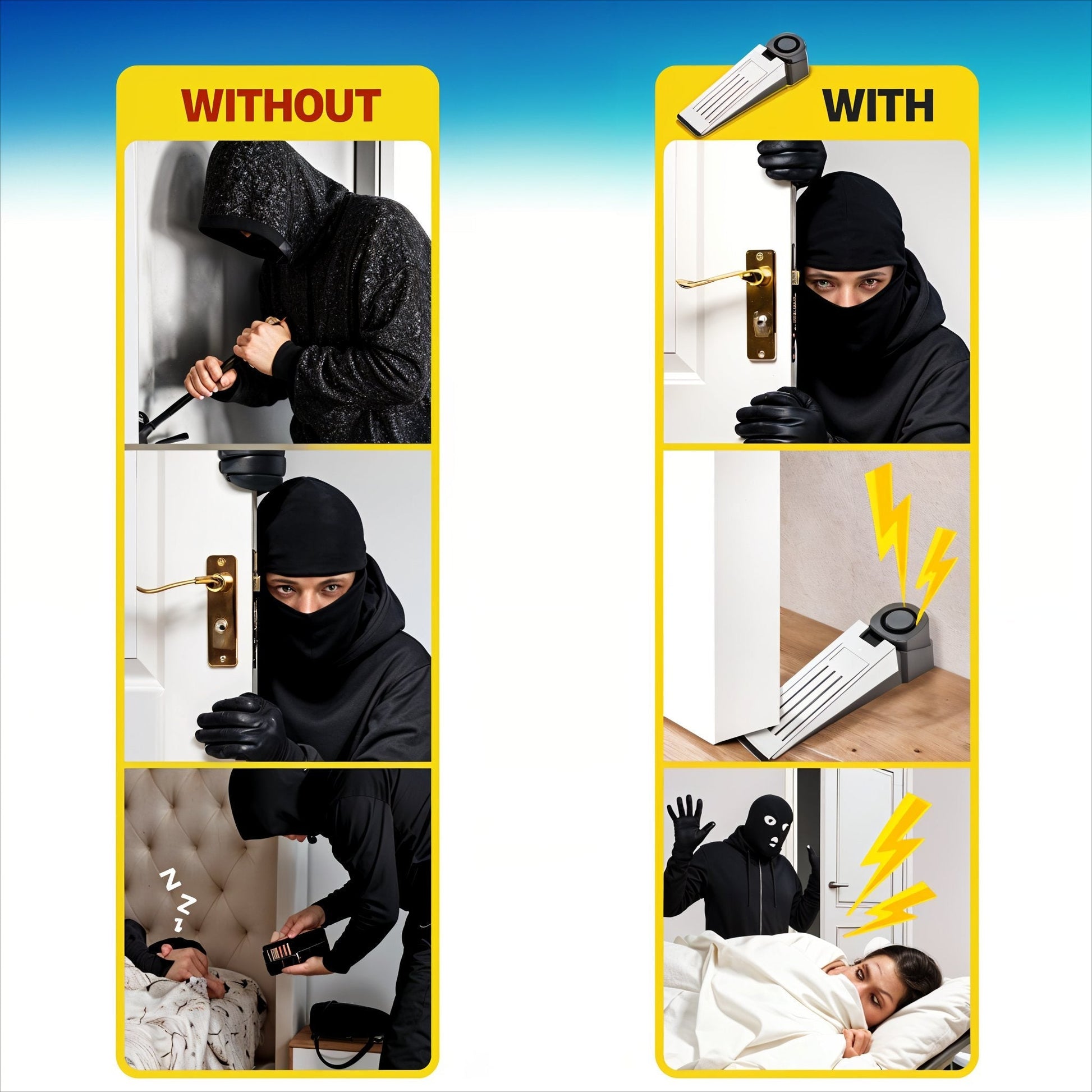 Ein ultimativer Türkeil mit Doppel-Funktion, der getestet und bewiesen wurde, maximale Türblockierungsleistung und Sicherheitsalarm Detektor zu bieten. Er verfügt über einen starken, gummierten Boden, der sicher auf Böden haftet und einen überlegenen Widerstand bietet, um Türen auch bei Kraftanwendung am Öffnen zu hindern. Zusätzlich ist dieses Gerät mit einem eingebauten 120 dB Alarm ausgestattet, der für 30 Sekunden ununterbrochen ertönt. Dadurch werden Eindringlinge abgeschreckt und alle alarmiert, dass ein Einbruchsversuch stattfindet, besonders auf Reisen. Ein ausgezeichneter Begleiter für verbesserten Türschutz und erhöhte Sicherheit, selbst wenn Sie im Urlaub oder auf Auslandsreisen sind. Geeignet für Zuhause, Hotelzimmer, Studentenwohnheim, Schlafzimmer, Airbnb, Zimmervermietung und mehr.